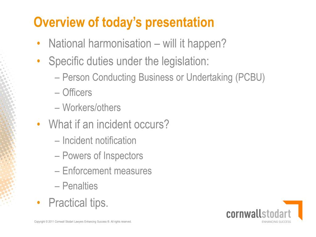 Overview of today’s presentation • National harmonisation – will it happen? • Specific duties under the legislation: • Person Conducting Business or Undertaking (PCBU) • Officers • Workers/others • What if an incident occurs? • Incident notification • Powers of Inspectors • Enforcement measures • Penalties • Practical tips.