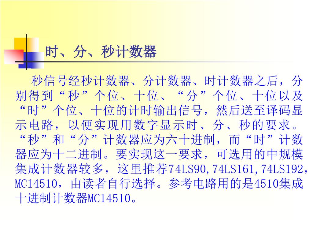 时、分、秒计数器 秒信号经秒计数器、分计数器、时计数器之后,分别得到“秒”个位、十位、“分”个位、十位以及“时”个位、十位的计时输出信号,然后送至译码显示电路,以便实现用数字显示时、分、秒的要求。“秒”和“分”计数器应为六十进制,而“时”计数器应为十二进制。要实现这一要求,可选用的中规模集成计数器较多,这里推荐74LS90,74LS161,74LS192,MC14510,由读者自行选择。参考电路用的是4510集成十进制计数器MC14510。