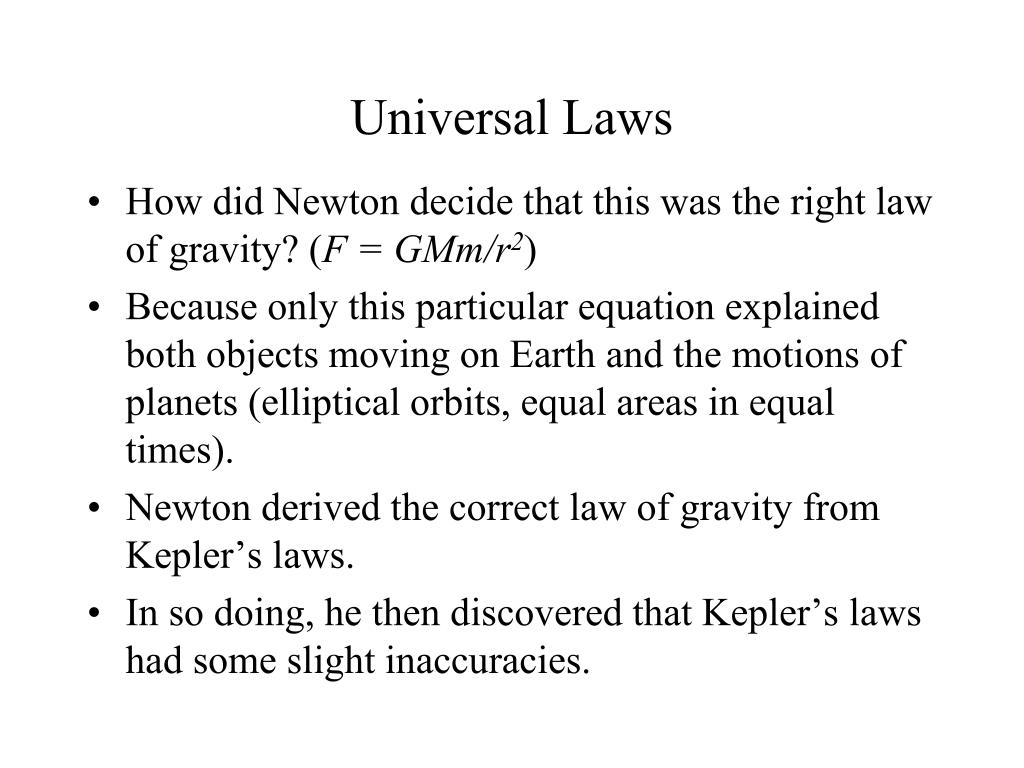Universal Laws • How did Newton decide that this was the right law of gravity? (F = GMm/r2) • Because only this particular equation explained both objects moving on Earth and the motions of planets (elliptical orbits, equal areas in equal times). • Newton derived the correct law of gravity from Kepler’s laws. • In so doing, he then discovered that Kepler’s laws had some slight inaccuracies.