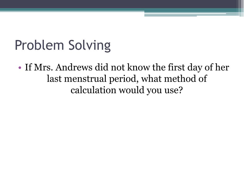 Problem Solving • If Mrs. Andrews did not know the first day of her last menstrual period, what method of calculation would you use?