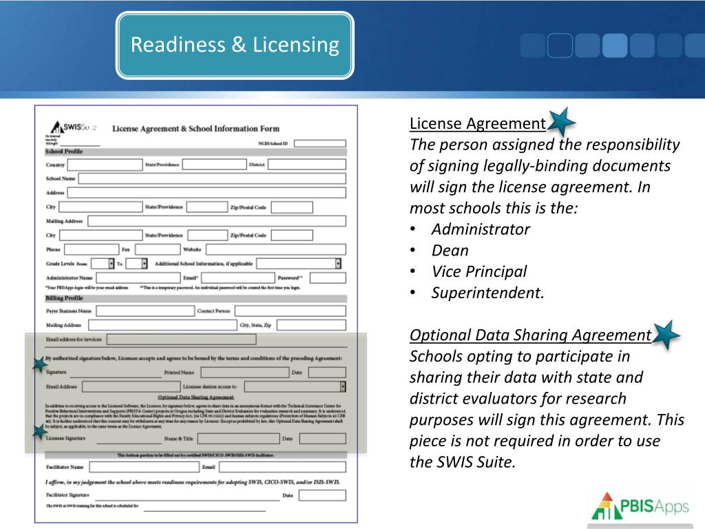 Readiness & Licensing • License Agreement • The person assigned the responsibility of signing legally-binding documents will sign the license agreement. In most schools this is the: • Administrator • Dean • Vice Principal • Superintendent. • Optional Data Sharing Agreement • Schools opting to participate in sharing their data with state and district evaluators for research purposes will sign this agreement. This piece is not required in order to use the SWIS Suite.