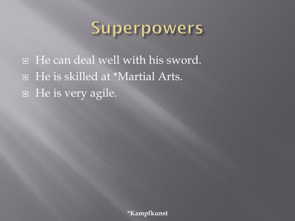Superpowers • He can deal wellwithhissword. • He isskilled at *Martial Arts. • He isvery agile. *Kampfkunst