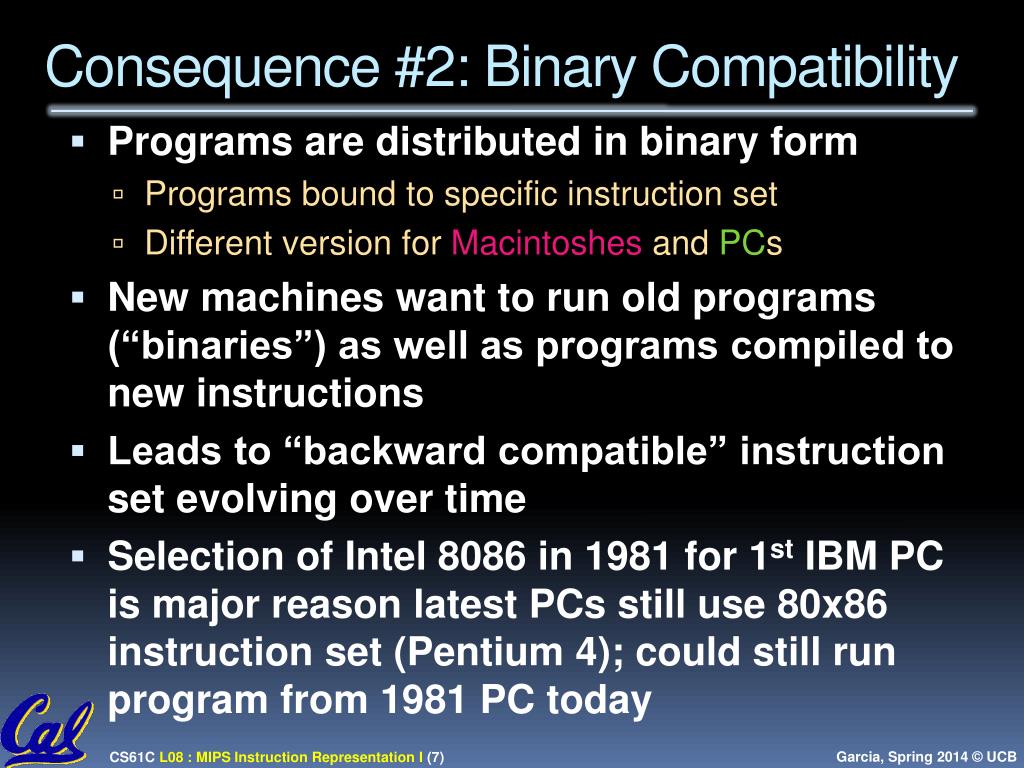 Consequence #2: Binary Compatibility • Programs are distributed in binary form • Programs bound to specific instruction set • Different version for Macintoshes and PCs • New machines want to run old programs (“binaries”) as well as programs compiled to new instructions • Leads to “backward compatible” instruction set evolving over time • Selection of Intel 8086 in 1981 for 1st IBM PC is major reason latest PCs still use 80x86 instruction set (Pentium 4); could still run program from 1981 PC today