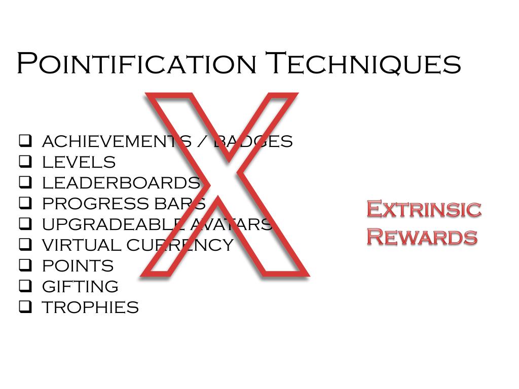 X Pointification Techniques • ACHIEVEMENTS / BADGES • LEVELS • LEADERBOARDS • PROGRESS BARS • UPGRADEABLE AVATARS • VIRTUAL CURRENCY • POINTS • GIFTING • TROPHIES Extrinsic Rewards