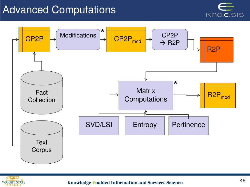 Advanced Computations * Modifications CP2P R2P CP2P CP2Pmod R2P R2Pmod * SVD/LSI Pertinence Fact Collection Text Corpus Entropy Matrix Computations