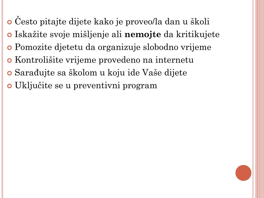 Često pitajte dijete kako je proveo/la dan u školi Iskažite svoje mišljenje ali nemojte da kritikujete Pomozite djetetu da organizuje slobodno vrijeme Kontrolišite vrijeme provedeno na internetu Sarađujte sa školom u koju ide Vaše dijete Uključite se u preventivni program