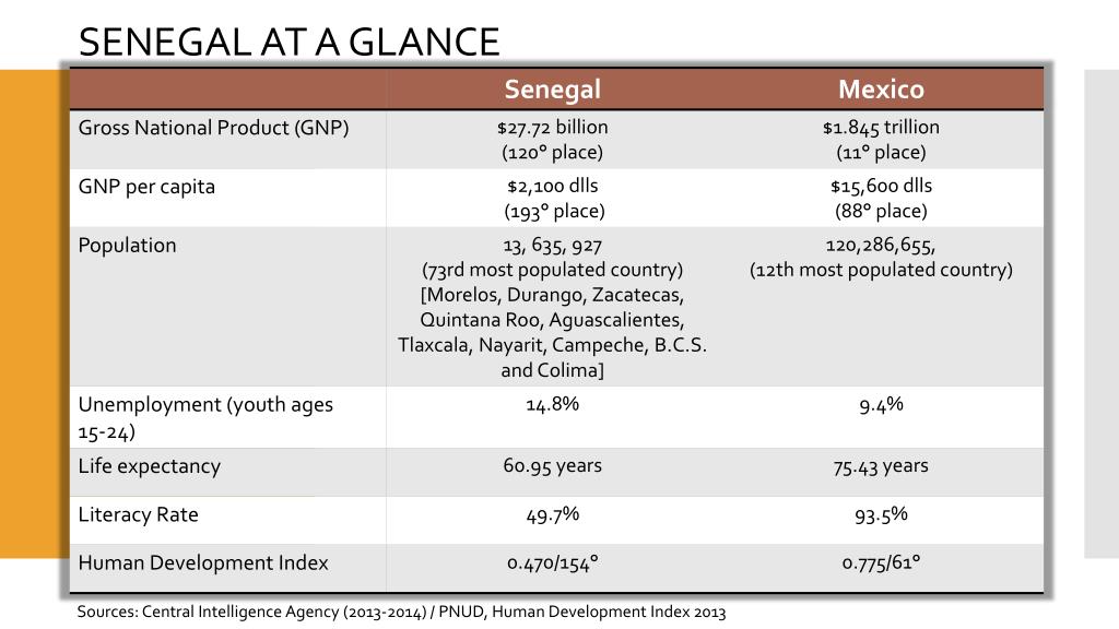 SENEGAL. Karen Benedicto Rosas African Studies July , 2014. San Luis Potosí Colima Michoacán Mexico City Campeche. GENERAL DATA. Area : 196,722 km2 . SENEGAL AT A GLANCE. Sources : Central Intelligence Agency (2013-2014) / PNUD, Human Development Index 2013.