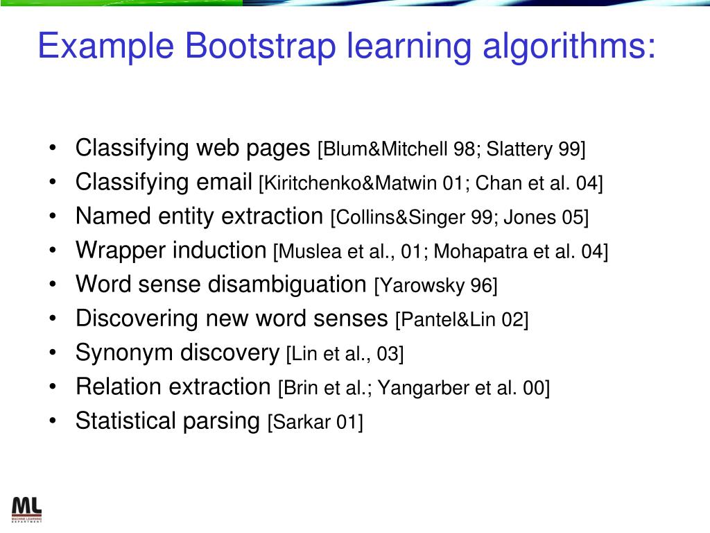 Example Bootstrap learning algorithms: • Classifying web pages [Blum&Mitchell 98; Slattery 99] • Classifying email [Kiritchenko&Matwin 01; Chan et al. 04] • Named entity extraction [Collins&Singer 99; Jones 05] • Wrapper induction [Muslea et al., 01; Mohapatra et al. 04] • Word sense disambiguation [Yarowsky 96] • Discovering new word senses [Pantel&Lin 02] • Synonym discovery [Lin et al., 03] • Relation extraction [Brin et al.; Yangarber et al. 00] • Statistical parsing [Sarkar 01]