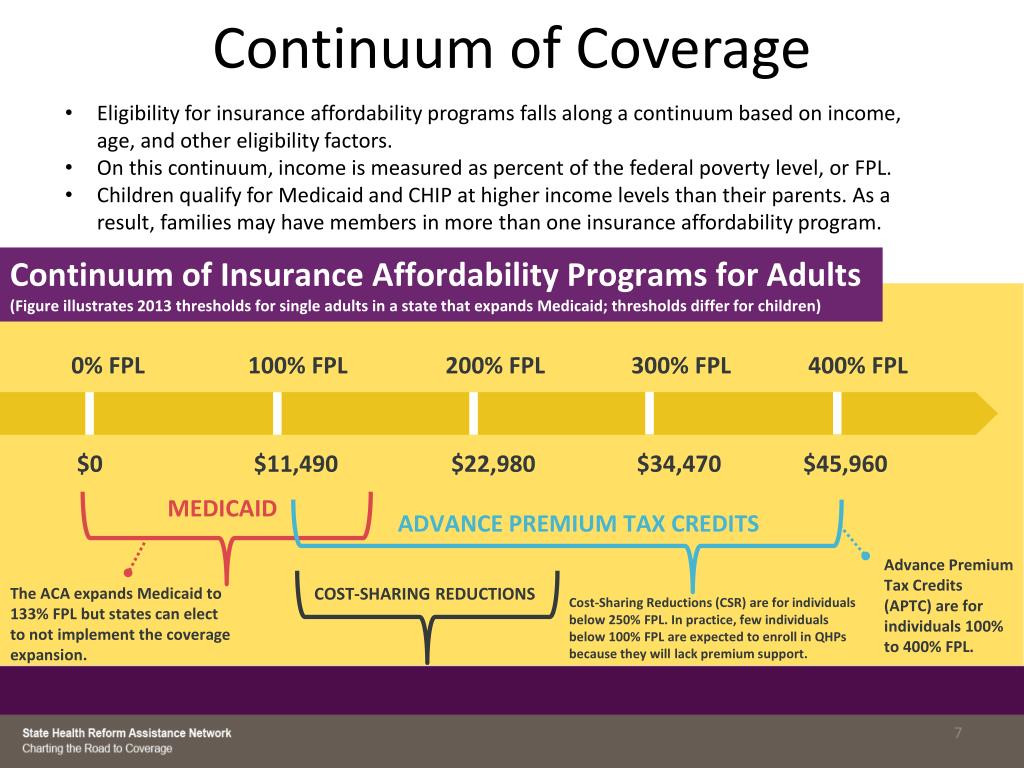 Continuum of Coverage • Eligibility for insurance affordability programs falls along a continuum based on income, age, and other eligibility factors. • On this continuum, income is measured as percent of the federal poverty level, or FPL. • Children qualify for Medicaid and CHIP at higher income levels than their parents. As a result, families may have members in more than one insurance affordability program. • Continuum of Insurance Affordability Programs for Adults • (Figure illustrates 2013 thresholds for single adults in a state that expands Medicaid; thresholds differ for children) 0% FPL 100% FPL 200% FPL 300% FPL 400% FPL $0 $11,490 $22,980 $34,470 $45,960 MEDICAID ADVANCE PREMIUM TAX CREDITS • Advance Premium Tax Credits (APTC) are for individuals 100% to 400% FPL. COST-SHARING REDUCTIONS • The ACA expands Medicaid to 133% FPL but states can elect to not implement the coverage expansion. • Cost-Sharing Reductions (CSR) are for individuals below 250% FPL. In practice, few individuals below 100% FPL are expected to enroll in QHPs because they will lack premium support.