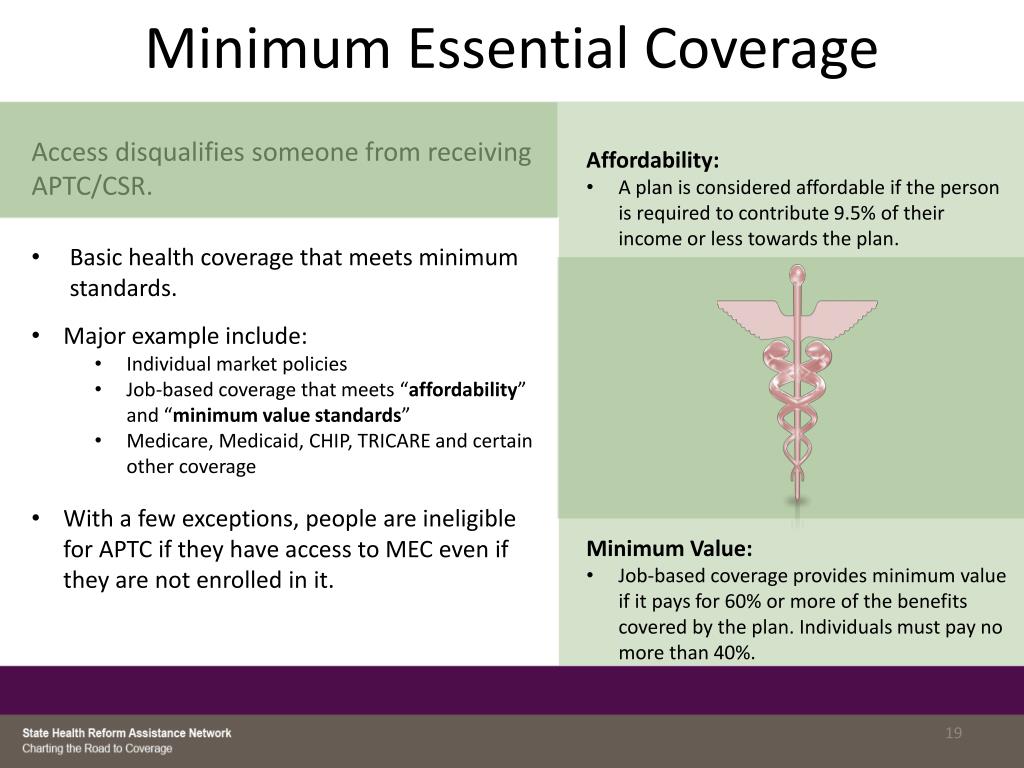 Minimum Essential Coverage Access disqualifies someone from receiving APTC/CSR. • Affordability: • A plan is considered affordable if the person is required to contribute 9.5% of their income or less towards the plan. • Basic health coverage that meets minimum standards. • Major example include: • Individual market policies • Job-based coverage that meets “affordability” and “minimum value standards” • Medicare, Medicaid, CHIP, TRICARE and certain other coverage • With a few exceptions, people are ineligible for APTC if they have access to MEC even if they are not enrolled in it. • Minimum Value: • Job-based coverage provides minimum value if it pays for 60% or more of the benefits covered by the plan. Individuals must pay no more than 40%.