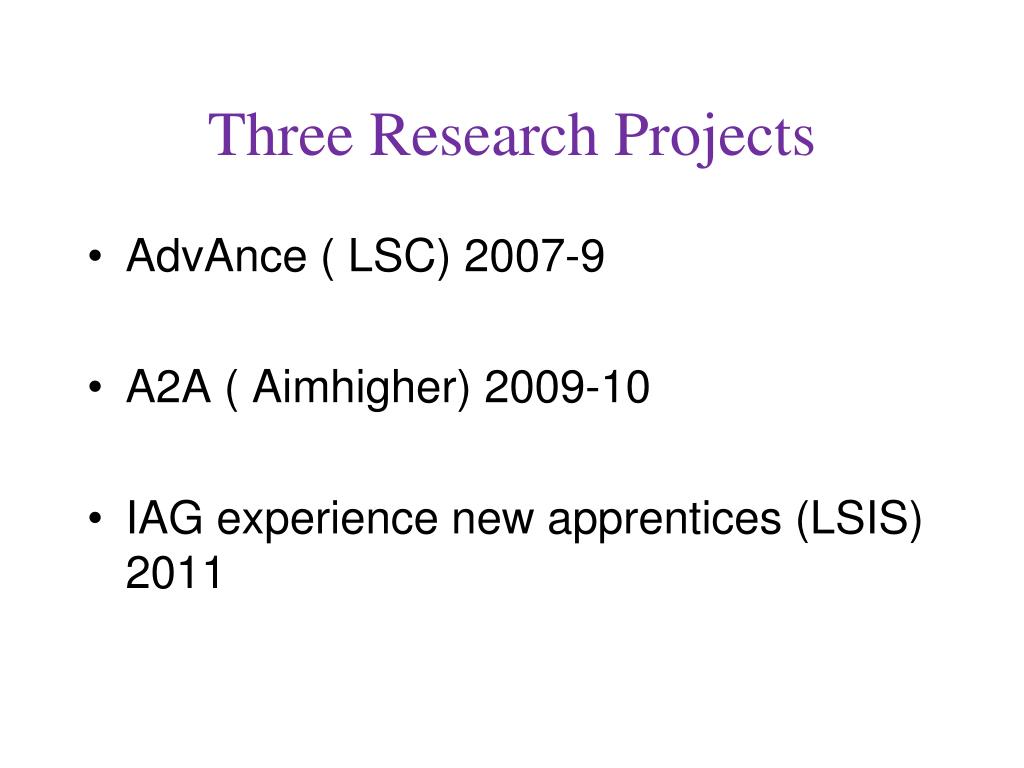 Three Research Projects • AdvAnce ( LSC) 2007-9 • A2A ( Aimhigher) 2009-10 • IAG experience new apprentices (LSIS) 2011