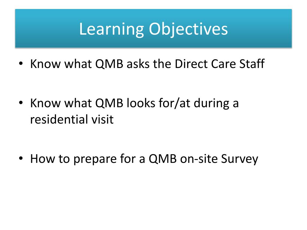 Learning Objectives • Know what QMB asks the Direct Care Staff • Know what QMB looks for/at during a residential visit • How to prepare for a QMB on-site Survey