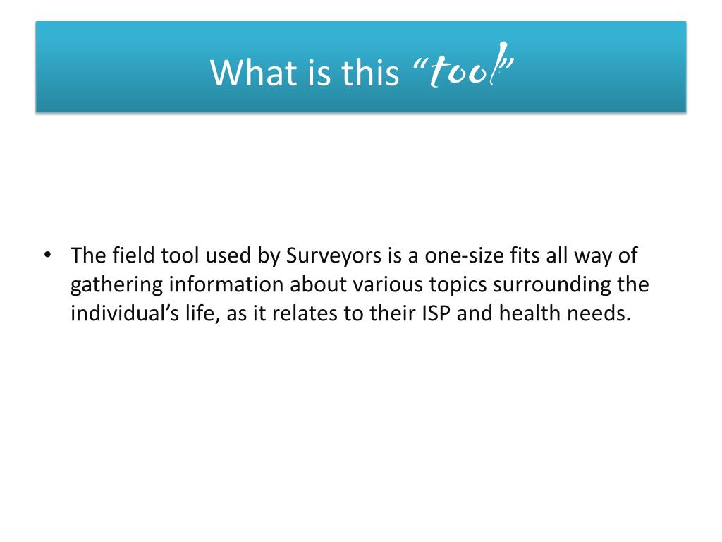 What is this “tool” • The field tool used by Surveyors is a one-size fits all way of gathering information about various topics surrounding the individual’s life, as it relates to their ISP and health needs.