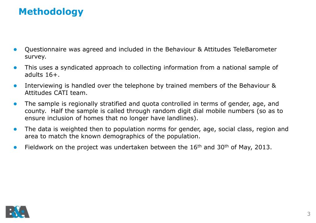 Methodology • Questionnaire was agreed and included in the Behaviour & Attitudes TeleBarometer survey. • This uses a syndicated approach to collecting information from a national sample of adults 16+. • Interviewing is handled over the telephone by trained members of the Behaviour & Attitudes CATI team. • The sample is regionally stratified and quota controlled in terms of gender, age, and county. Half the sample is called through random digit dial mobile numbers (so as to ensure inclusion of homes that no longer have landlines). • The data is weighted then to population norms for gender, age, social class, region and area to match the known demographics of the population. • Fieldwork on the project was undertaken between the 16th and 30th of May, 2013.