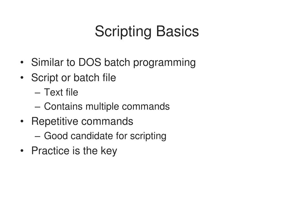 Scripting Basics • Similar to DOS batch programming • Script or batch file • Text file • Contains multiple commands • Repetitive commands • Good candidate for scripting • Practice is the key