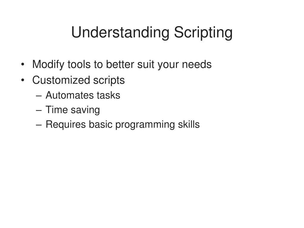 Understanding Scripting • Modify tools to better suit your needs • Customized scripts • Automates tasks • Time saving • Requires basic programming skills