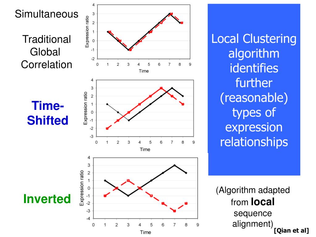 Time-Shifted Inverted Simultaneous Traditional Global Correlation Local Clustering algorithm identifies further (reasonable) types of expression relationships (Algorithm adapted from local sequence alignment) [Qian et al]