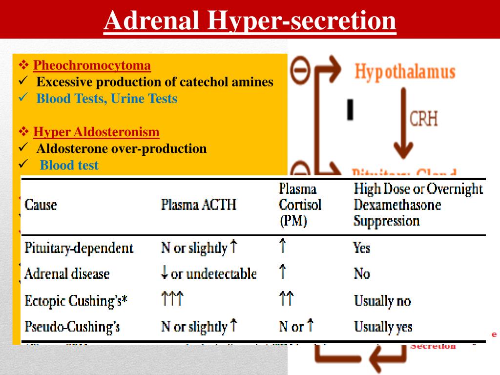 Adrenal Hyper-secretion • Pheochromocytoma • Excessive production of catechol amines • Blood Tests, Urine Tests • Hyper Aldosteronism • Aldosterone over-production • Blood test • Virilization • High amounts of androgens • Blood tests, CT scan, MRI, or ultrasound • Cushing's syndrome • Over-production of cortisol