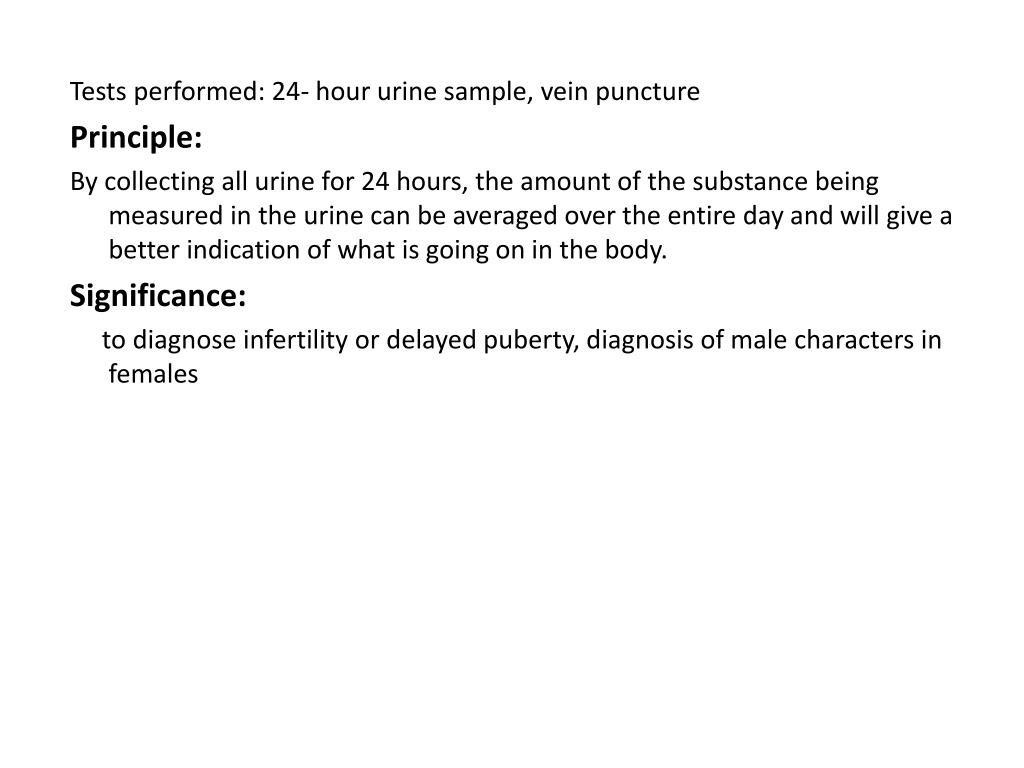 Tests performed: 24- hour urine sample, vein puncture Principle: By collecting all urine for 24 hours, the amount of the substance being measured in the urine can be averaged over the entire day and will give a better indication of what is going on in the body. Significance: to diagnose infertility or delayed puberty, diagnosis of male characters in females