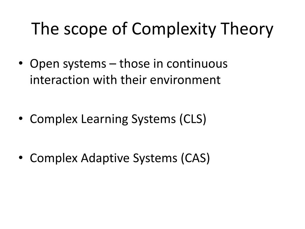 The scope of Complexity Theory • Open systems – those in continuous interaction with their environment • Complex Learning Systems (CLS) • Complex Adaptive Systems (CAS)