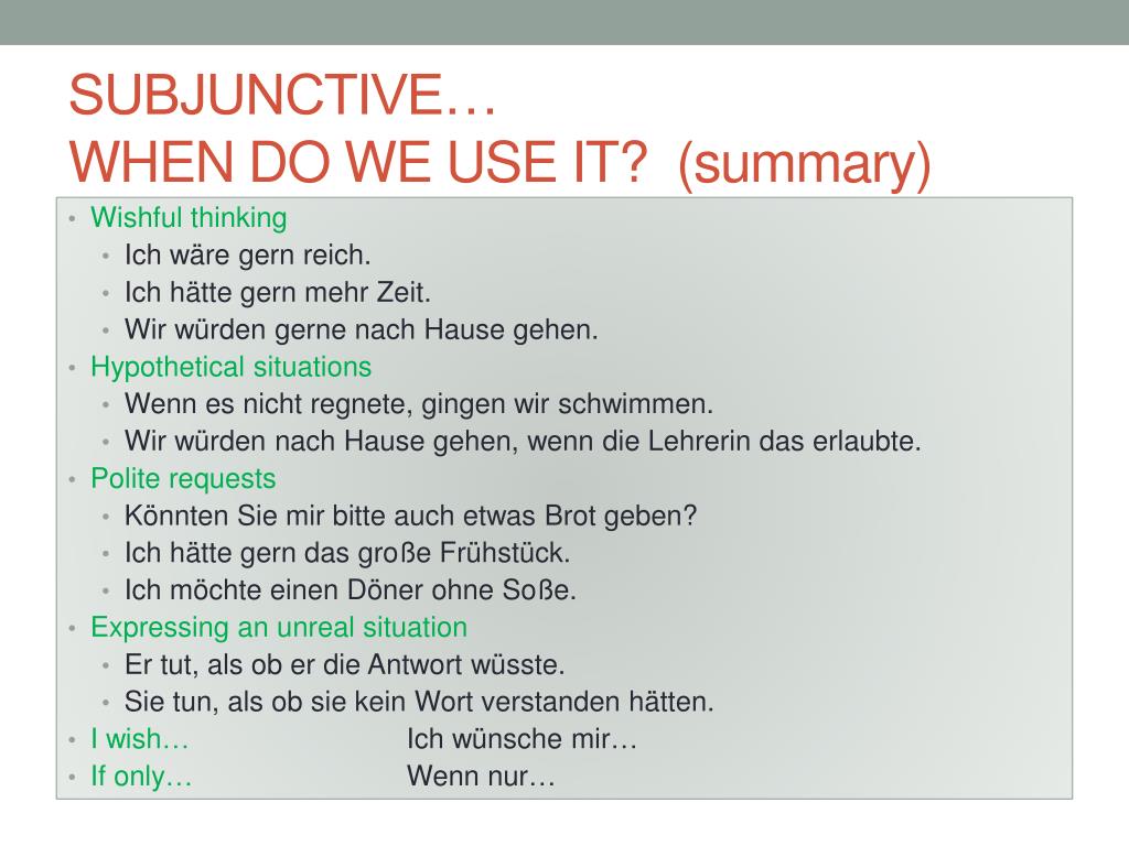 SUBJUNCTIVE… WHEN DO WE USE IT? (summary) • Wishful thinking • Ichwäregernreich. • IchhättegernmehrZeit. • WirwürdengernenachHausegehen. • Hypothetical situations • Wennesnichtregnete, gingenwirschwimmen. • WirwürdennachHausegehen, wenn die Lehrerin das erlaubte. • Polite requests • KönntenSiemirbitteauchetwasBrotgeben? • Ichhättegern das großeFrühstück. • IchmöchteeinenDönerohneSoße. • Expressing an unreal situation • Er tut, alsober die Antwortwüsste. • Sietun, alsobsiekeinWortverstandenhätten. • I wish… Ichwünschemir… • If only… Wennnur…
