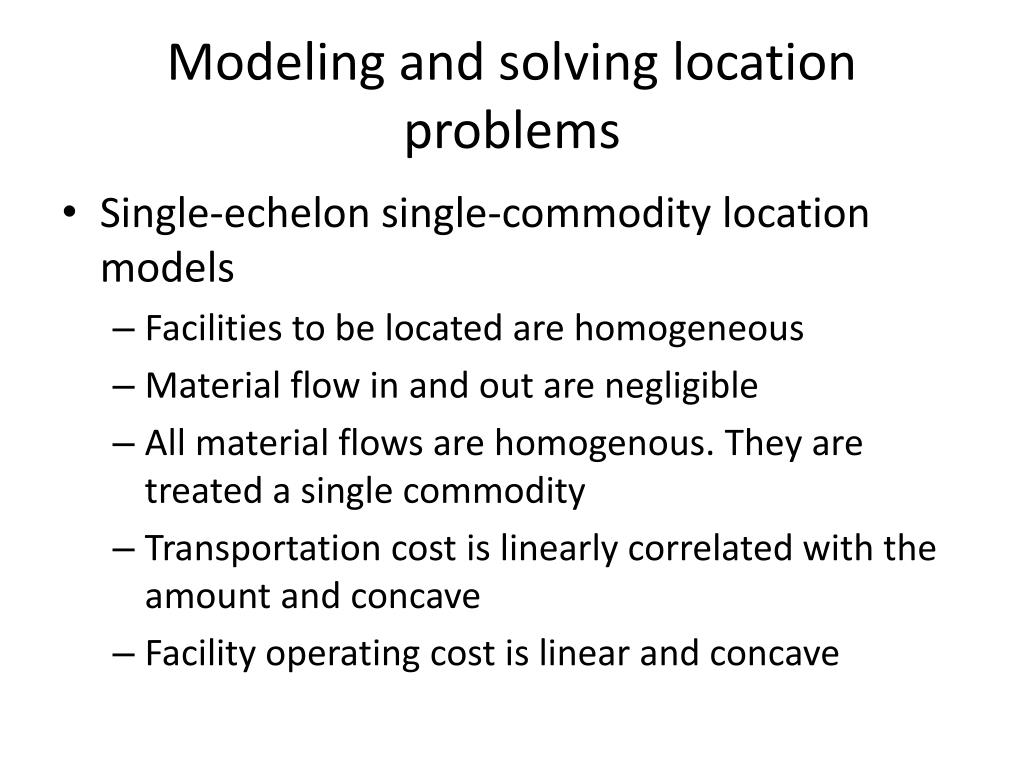 Modeling and solving location problems • Single-echelon single-commodity location models • Facilities to be located are homogeneous • Material flow in and out are negligible • All material flows are homogenous. They are treated a single commodity • Transportation cost is linearly correlated with the amount and concave • Facility operating cost is linear and concave