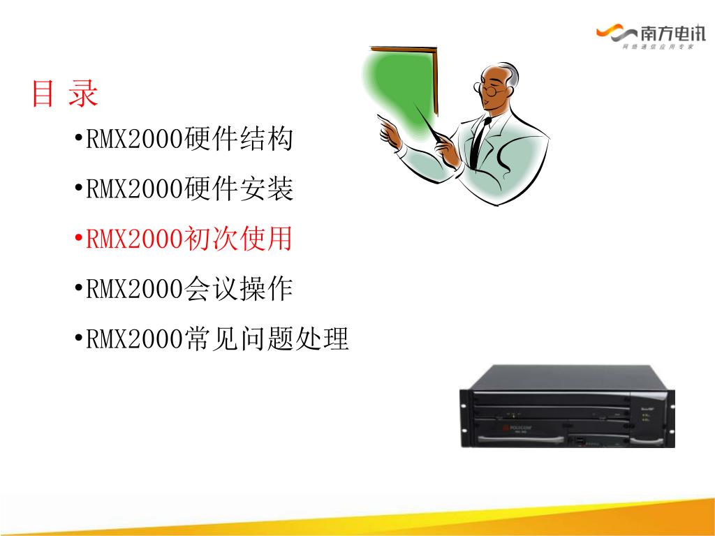 目 录 • RMX2000硬件结构 • RMX2000硬件安装 • RMX2000软件安装 • RMX2000会议操作 • RMX2000常见问题处理