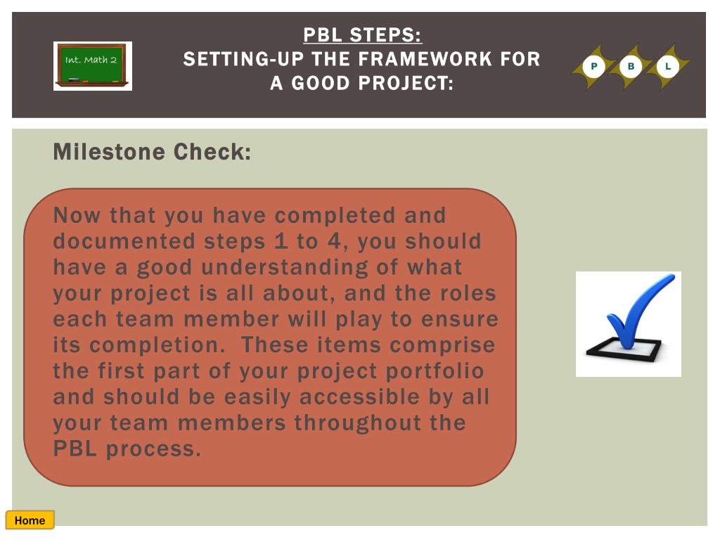 PBL Steps:Setting-up the Framework for a Good Project: Milestone Check: Now that you have completed and documented steps 1 to 4, you should have a good understanding of what your project is all about, and the roles each team member will play to ensure its completion. These items comprise the first part of your project portfolio and should be easily accessible by all your team members throughout the PBL process. Home