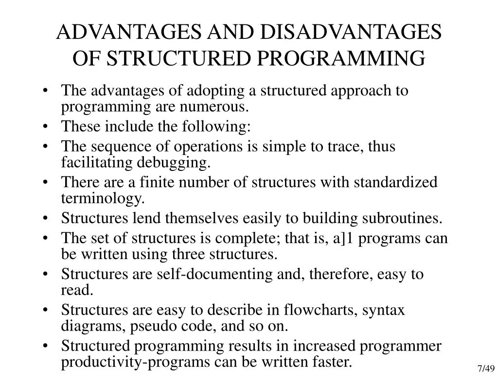 ADVANTAGES AND DISADVANTAGES OF STRUCTURED PROGRAMMING • The advantages of adopting a structured approach to programming are numerous. • These include the following: • The sequence of operations is simple to trace, thus facilitating debugging. • There are a finite number of structures with standardized terminology. • Structures lend themselves easily to building subroutines. • The set of structures is complete; that is, a]1 programs can be written using three structures. • Structures are self-documenting and, therefore, easy to read. • Structures are easy to describe in flowcharts, syntax diagrams, pseudo code, and so on. • Structured programming results in increased programmer productivity-programs can be written faster.