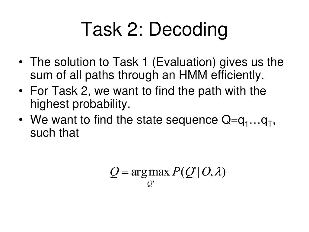 Task 2: Decoding • The solution to Task 1 (Evaluation) gives us the sum of all paths through an HMM efficiently. • For Task 2, we want to find the path with the highest probability. • We want to find the state sequence Q=q1…qT, such that