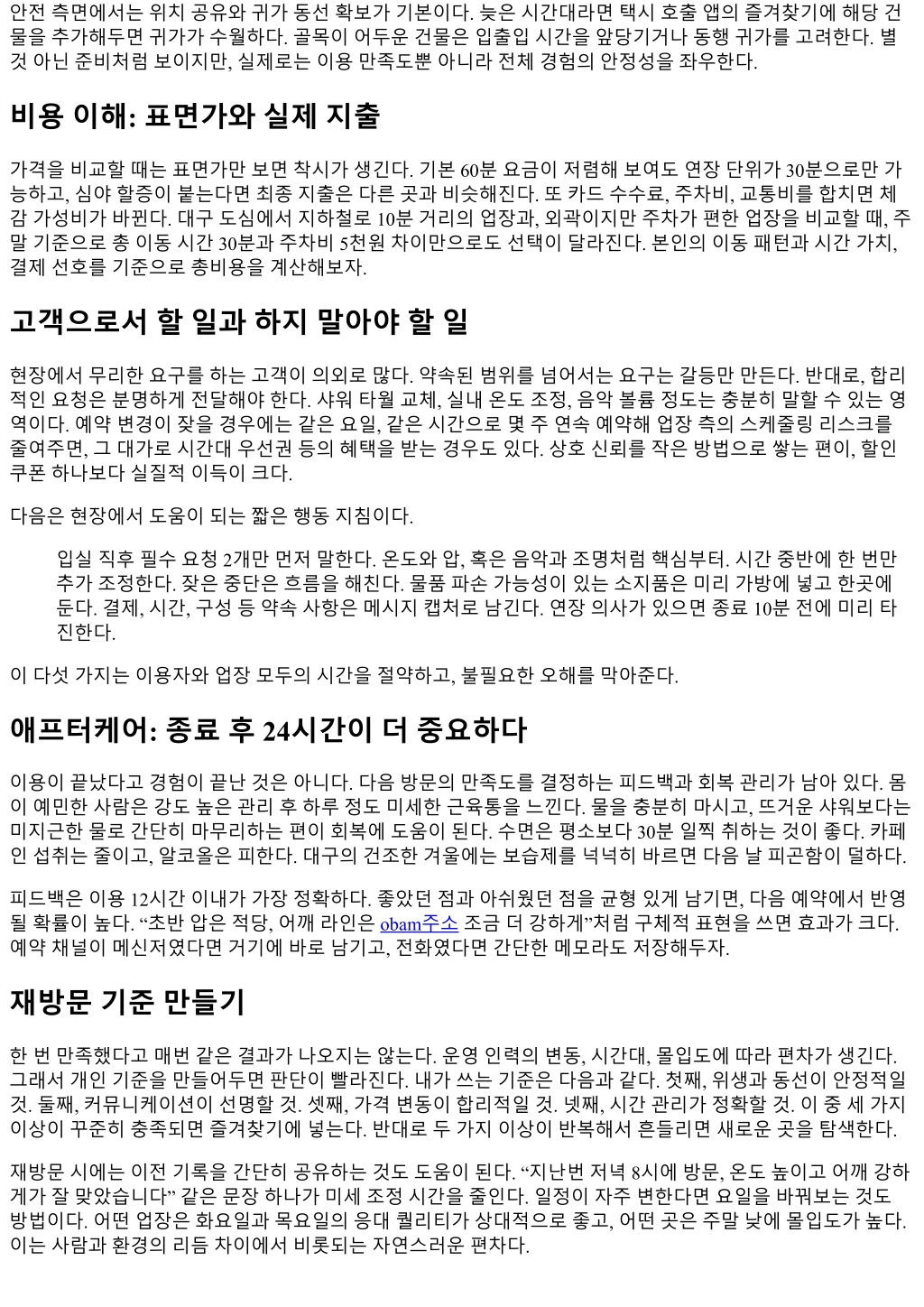 안전측면에서는위치공유와귀가동선확보가기본이다. 늦은시간대라면택시호출앱의즐겨찾기에해당건 물을추가해두면귀가가수월하다. 골목이어두운건물은입출입시간을앞당기거나동행귀가를고려한다. 별 것아닌준비처럼보이지만, 실제로는이용만족도뿐아니라전체경험의안정성을좌우한다. 비용이해: 표면가와실제지출 가격을비교할때는표면가만보면착시가생긴다. 기본 60분요금이저렴해보여도연장단위가 30분으로만가 능하고, 심야할증이붙는다면최종지출은다른곳과비슷해진다. 또카드수수료, 주차비, 교통비를합치면체 감가성비가바뀐다. 대구도심에서지하철로 10분거리의업장과, 외곽이지만주차가편한업장을비교할때, 주 말기준으로총이동시간 30분과주차비 5천원차이만으로도선택이달라진다. 본인의이동패턴과시간가치, 결제선호를기준으로총비용을계산해보자. 고객으로서할일과하지말아야할일 현장에서무리한요구를하는고객이의외로많다. 약속된범위를넘어서는요구는갈등만만든다. 반대로, 합리 적인요청은분명하게전달해야한다. 샤워타월교체, 실내온도조정, 음악볼륨정도는충분히말할수있는영 역이다. 예약변경이잦을경우에는같은요일, 같은시간으로몇주연속예약해업장측의스케줄링리스크를 줄여주면, 그대가로시간대우선권등의혜택을받는경우도있다. 상호신뢰를작은방법으로쌓는편이, 할인 쿠폰하나보다실질적이득이크다. 다음은현장에서도움이되는짧은행동지침이다. 입실직후필수요청 2개만먼저말한다. 온도와압, 혹은음악과조명처럼핵심부터. 시간중반에한번만 추가조정한다. 잦은중단은흐름을해친다. 물품파손가능성이있는소지품은미리가방에넣고한곳에 둔다. 결제, 시간, 구성등약속사항은메시지캡처로남긴다. 연장의사가있으면종료 10분전에미리타 진한다. 이다섯가지는이용자와업장모두의시간을절약하고, 불필요한오해를막아준다. 애프터케어: 종료후 24시간이더중요하다 이용이끝났다고경험이끝난것은아니다. 다음방문의만족도를결정하는피드백과회복관리가남아있다. 몸 이예민한사람은강도높은관리후하루정도미세한근육통을느낀다. 물을충분히마시고, 뜨거운샤워보다는 미지근한물로간단히마무리하는편이회복에도움이된다. 수면은평소보다 30분일찍취하는것이좋다. 카페 인섭취는줄이고, 알코올은피한다. 대구의건조한겨울에는보습제를넉넉히바르면다음날피곤함이덜하다. 피드백은이용 12시간이내가가장정확하다. 좋았던점과아쉬웠던점을균형있게남기면, 다음예약에서반영 될확률이높다. “초반압은적당, 어깨라인은obam주소조금더강하게”처럼구체적표현을쓰면효과가크다. 예약채널이메신저였다면거기에바로남기고, 전화였다면간단한메모라도저장해두자. 재방문기준만들기 한번만족했다고매번같은결과가나오지는않는다. 운영인력의변동, 시간대, 몰입도에따라편차가생긴다. 그래서개인기준을만들어두면판단이빨라진다. 내가쓰는기준은다음과같다. 첫째, 위생과동선이안정적일 것. 둘째, 커뮤니케이션이선명할것. 셋째, 가격변동이합리적일것. 넷째, 시간관리가정확할것. 이중세가지 이상이꾸준히충족되면즐겨찾기에넣는다. 반대로두가지이상이반복해서흔들리면새로운곳을탐색한다. 재방문시에는이전기록을간단히공유하는것도도움이된다. “지난번저녁 8시에방문, 온도높이고어깨강하 게가잘맞았습니다” 같은문장하나가미세조정시간을줄인다. 일정이자주변한다면요일을바꿔보는것도 방법이다. 어떤업장은화요일과목요일의응대퀄리티가상대적으로좋고, 어떤곳은주말낮에몰입도가높다. 이는사람과환경의리듬차이에서비롯되는자연스러운편차다.