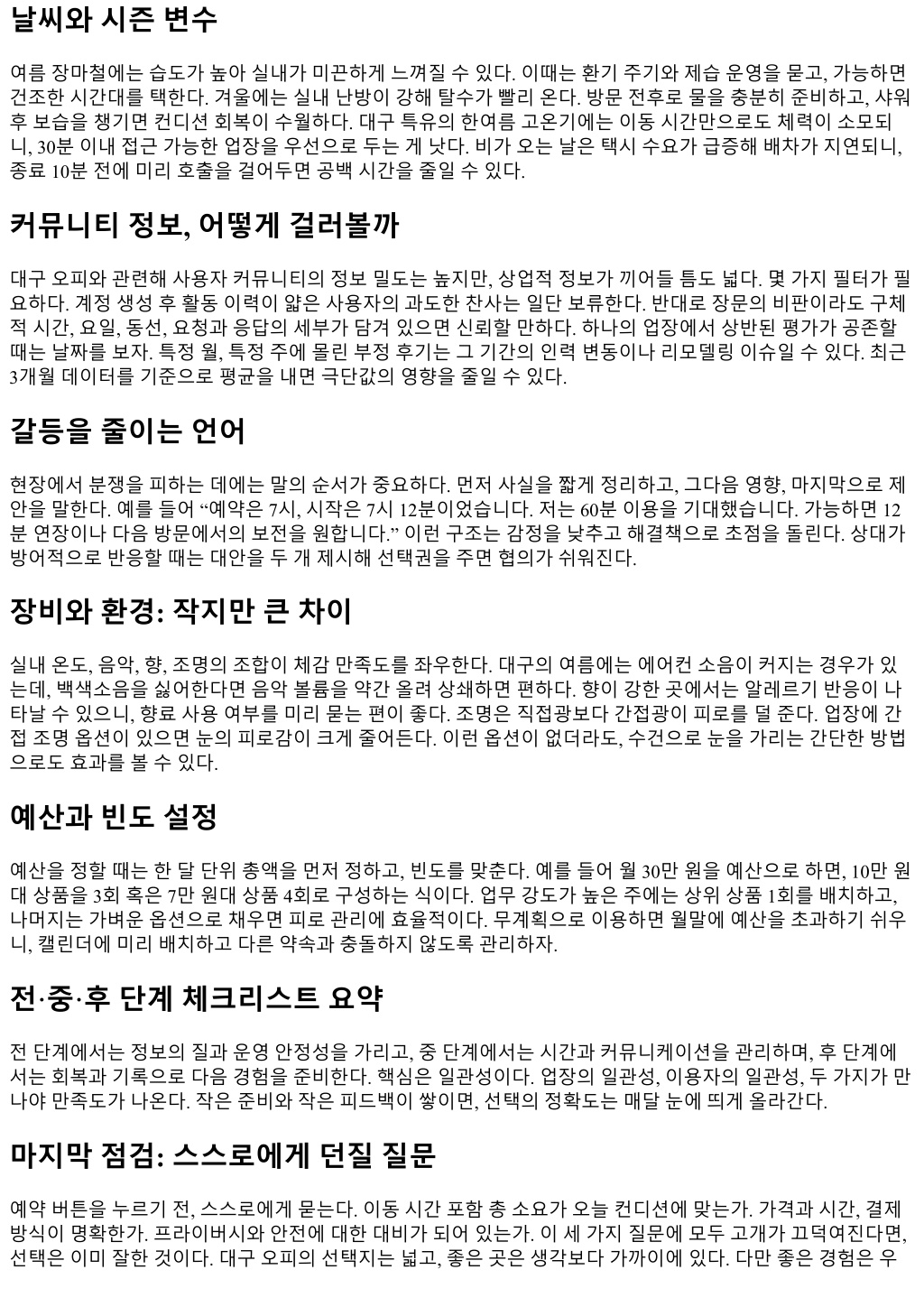 날씨와시즌변수 여름장마철에는습도가높아실내가미끈하게느껴질수있다. 이때는환기주기와제습운영을묻고, 가능하면 건조한시간대를택한다. 겨울에는실내난방이강해탈수가빨리온다. 방문전후로물을충분히준비하고, 샤워 후보습을챙기면컨디션회복이수월하다. 대구특유의한여름고온기에는이동시간만으로도체력이소모되 니, 30분이내접근가능한업장을우선으로두는게낫다. 비가오는날은택시수요가급증해배차가지연되니, 종료 10분전에미리호출을걸어두면공백시간을줄일수있다. 커뮤니티정보, 어떻게걸러볼까 대구오피와관련해사용자커뮤니티의정보밀도는높지만, 상업적정보가끼어들틈도넓다. 몇가지필터가필 요하다. 계정생성후활동이력이얇은사용자의과도한찬사는일단보류한다. 반대로장문의비판이라도구체 적시간, 요일, 동선, 요청과응답의세부가담겨있으면신뢰할만하다. 하나의업장에서상반된평가가공존할 때는날짜를보자. 특정월, 특정주에몰린부정후기는그기간의인력변동이나리모델링이슈일수있다. 최근 3개월데이터를기준으로평균을내면극단값의영향을줄일수있다. 갈등을줄이는언어 현장에서분쟁을피하는데에는말의순서가중요하다. 먼저사실을짧게정리하고, 그다음영향, 마지막으로제 안을말한다. 예를들어 “예약은 7시, 시작은 7시 12분이었습니다. 저는 60분이용을기대했습니다. 가능하면 12 분연장이나다음방문에서의보전을원합니다.” 이런구조는감정을낮추고해결책으로초점을돌린다. 상대가 방어적으로반응할때는대안을두개제시해선택권을주면협의가쉬워진다. 장비와환경: 작지만큰차이 실내온도, 음악, 향, 조명의조합이체감만족도를좌우한다. 대구의여름에는에어컨소음이커지는경우가있 는데, 백색소음을싫어한다면음악볼륨을약간올려상쇄하면편하다. 향이강한곳에서는알레르기반응이나 타날수있으니, 향료사용여부를미리묻는편이좋다. 조명은직접광보다간접광이피로를덜준다. 업장에간 접조명옵션이있으면눈의피로감이크게줄어든다. 이런옵션이없더라도, 수건으로눈을가리는간단한방법 으로도효과를볼수있다. 예산과빈도설정 예산을정할때는한달단위총액을먼저정하고, 빈도를맞춘다. 예를들어월 30만원을예산으로하면, 10만원 대상품을 3회혹은 7만원대상품 4회로구성하는식이다. 업무강도가높은주에는상위상품 1회를배치하고, 나머지는가벼운옵션으로채우면피로관리에효율적이다. 무계획으로이용하면월말에예산을초과하기쉬우 니, 캘린더에미리배치하고다른약속과충돌하지않도록관리하자. 전·중·후단계체크리스트요약 전단계에서는정보의질과운영안정성을가리고, 중단계에서는시간과커뮤니케이션을관리하며, 후단계에 서는회복과기록으로다음경험을준비한다. 핵심은일관성이다. 업장의일관성, 이용자의일관성, 두가지가만 나야만족도가나온다. 작은준비와작은피드백이쌓이면, 선택의정확도는매달눈에띄게올라간다. 마지막점검: 스스로에게던질질문 예약버튼을누르기전, 스스로에게묻는다. 이동시간포함총소요가오늘컨디션에맞는가. 가격과시간, 결제 방식이명확한가. 프라이버시와안전에대한대비가되어있는가. 이세가지질문에모두고개가끄덕여진다면, 선택은이미잘한것이다. 대구오피의선택지는넓고, 좋은곳은생각보다가까이에있다. 다만좋은경험은우
