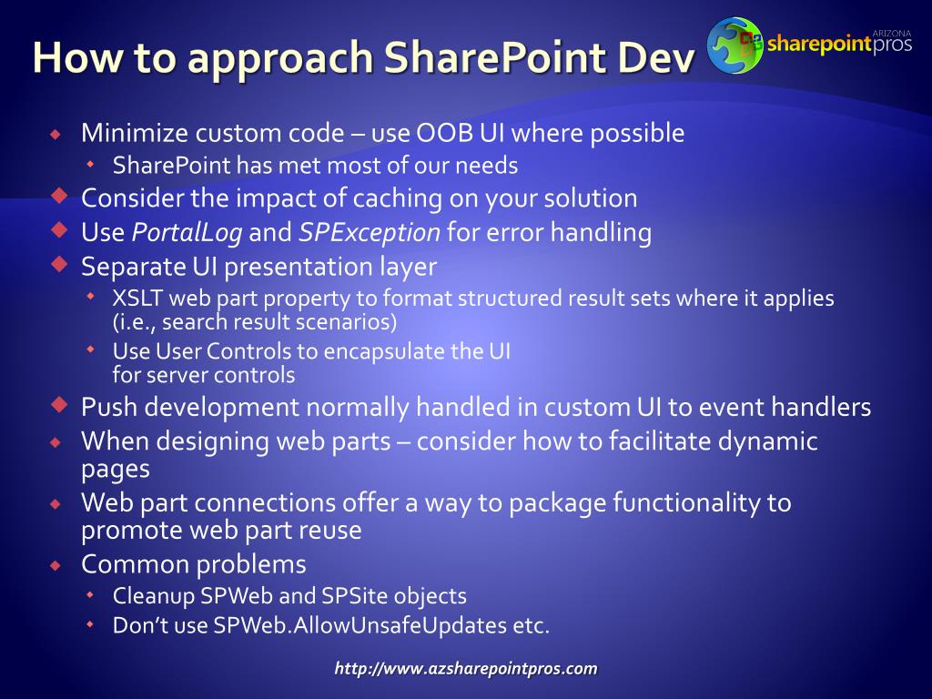 How to approach SharePoint Dev • Minimize custom code – use OOB UI where possible • SharePoint has met most of our needs • Consider the impact of caching on your solution • Use PortalLog and SPException for error handling • Separate UI presentation layer • XSLT web part property to format structured result sets where it applies (i.e., search result scenarios) • Use User Controls to encapsulate the UI for server controls • Push development normally handled in custom UI to event handlers • When designing web parts – consider how to facilitate dynamic pages • Web part connections offer a way to package functionality to promote web part reuse • Common problems • Cleanup SPWeb and SPSite objects • Don’t use SPWeb.AllowUnsafeUpdates etc.