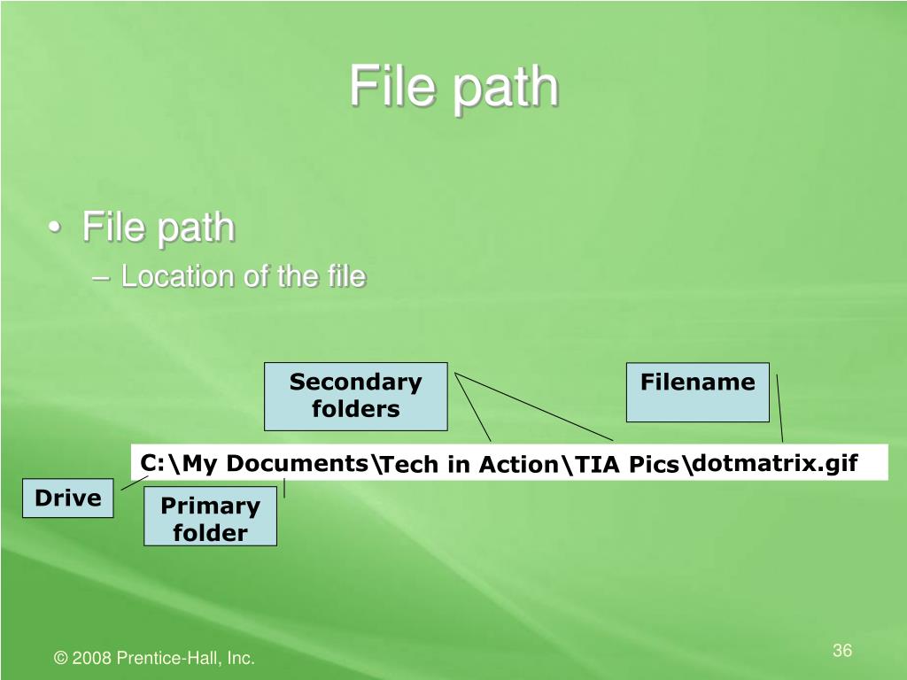 File path • File path • Location of the file Secondary folders Filename C: dotmatrix.gif \My Documents\ Tech in Action\TIA Pics\ Drive Primary folder
