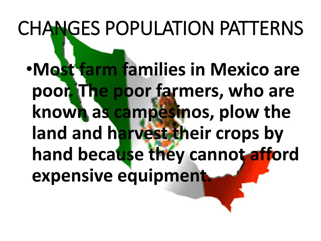 CHANGES POPULATION PATTERNS • Most farm families in Mexico are poor. The poor farmers, who are known as campesinos, plow the land and harvest their crops by hand because they cannot afford expensive equipment.