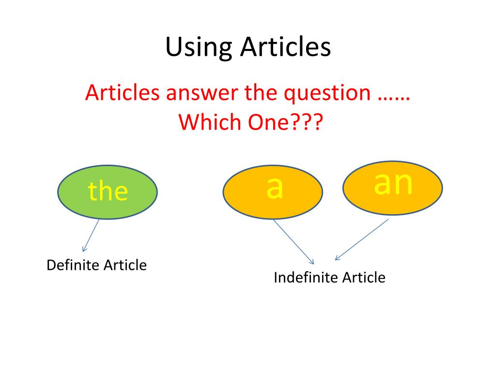 Using Articles Articles answer the question …… Which One??? an a the Definite Article Indefinite Article