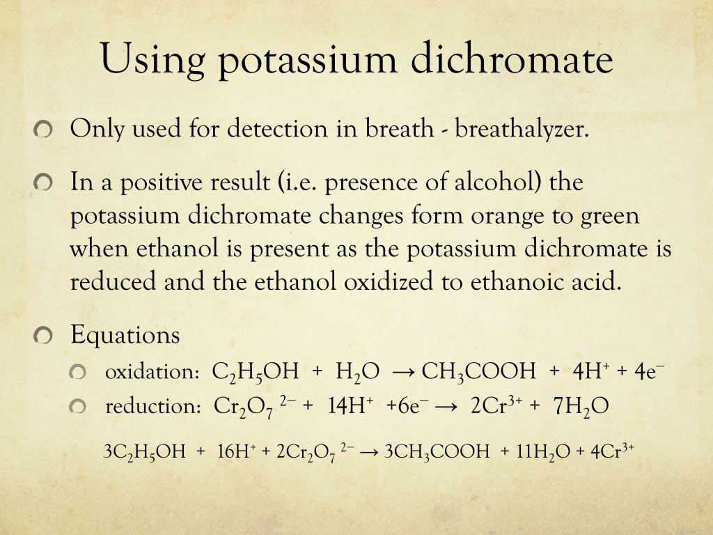 Using potassium dichromate • Only used for detection in breath - breathalyzer. • In a positive result (i.e. presence of alcohol) the potassium dichromate changes form orange to green when ethanol is present as the potassium dichromate is reduced and the ethanol oxidized to ethanoic acid. • Equations • oxidation: C2H5OH + H2O → CH3COOH + 4H+ + 4e− • reduction: Cr2O72− + 14H+ +6e− → 2Cr3+ + 7H2O 3C2H5OH + 16H+ + 2Cr2O72− → 3CH3COOH + 11H2O + 4Cr3+