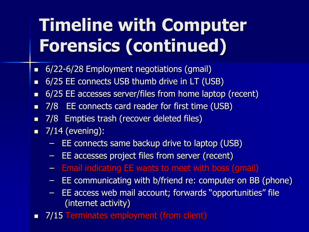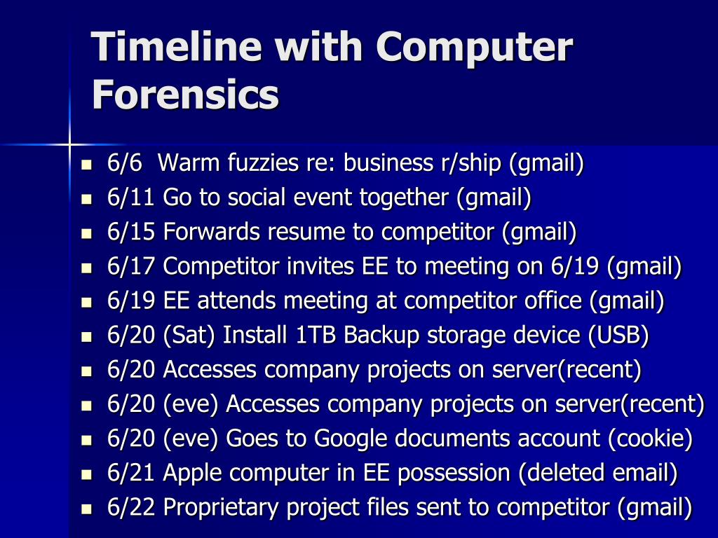 Timeline with Computer Forensics • 6/6 Warm fuzzies re: business r/ship (gmail) • 6/11 Go to social event together (gmail) • 6/15 Forwards resume to competitor (gmail) • 6/17 Competitor invites EE to meeting on 6/19 (gmail) • 6/19 EE attends meeting at competitor office (gmail) • 6/20 (Sat) Install 1TB Backup storage device (USB) • 6/20 Accesses company projects on server(recent) • 6/20 (eve) Accesses company projects on server(recent) • 6/20 (eve) Goes to Google documents account (cookie) • 6/21 Apple computer in EE possession (deleted email) • 6/22 Proprietary project files sent to competitor (gmail)