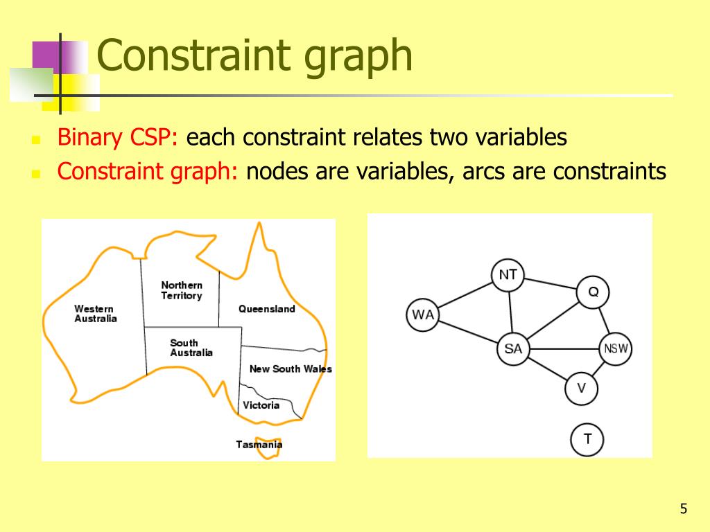 Constraint graph • Binary CSP: each constraint relates two variables • Constraint graph: nodes are variables, arcs are constraints