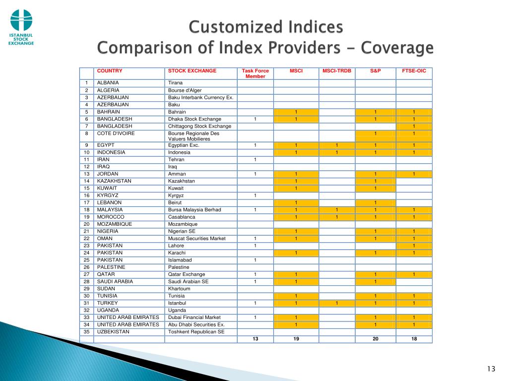 Customized IndicesConsultations with the Index Providers • Paradox: • Numerous Islamic indices / Non-Islamic countries’ equities • Purpose: • To include Shariah-compliant equities from OIC Member States’ Stock Exchanges • Priorities: • Facilitating the collaboration among the OIC Exchanges • Promoting the OIC Member States’ Stock Exchanges Forum • Creating different investment alternatives