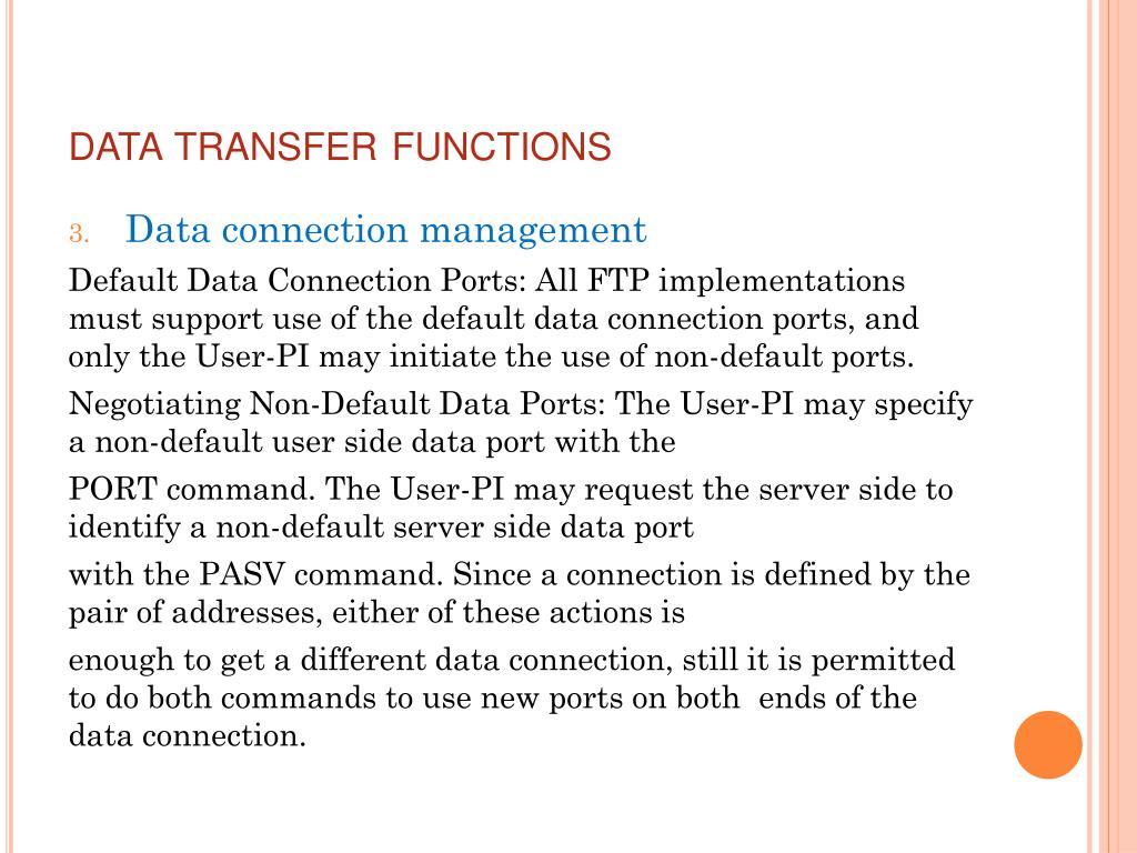 data transfer functions • Data connection management Default Data Connection Ports: All FTP implementations must support use of the default data connection ports, and only the User-PI may initiate the use of non-default ports. Negotiating Non-Default Data Ports: The User-PI may specify a non-default user side data port with the PORT command. The User-PI may request the server side to identify a non-default server side data port with the PASV command. Since a connection is defined by the pair of addresses, either of these actions is enough to get a different data connection, still it is permitted to do both commands to use new ports on both ends of the data connection.