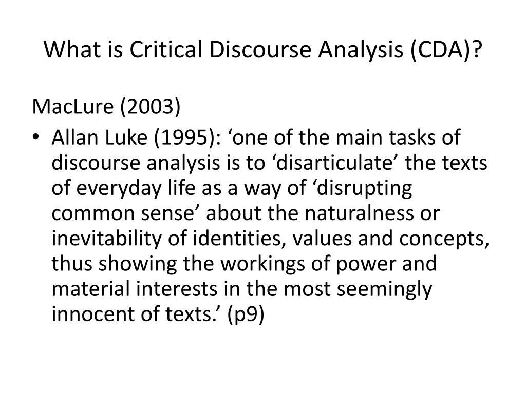 What is Critical Discourse Analysis (CDA)? MacLure (2003) • Allan Luke (1995): ‘one of the main tasks of discourse analysis is to ‘disarticulate’ the texts of everyday life as a way of ‘disrupting common sense’ about the naturalness or inevitability of identities, values and concepts, thus showing the workings of power and material interests in the most seemingly innocent of texts.’ (p9)