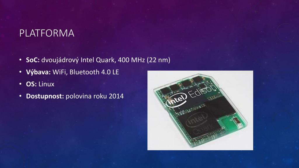 Intel Edison. kompletní počítač v rozměrech SD karty Vypracoval Denis jurenka 2.e. Platforma. SoC : dvoujádrový Intel Quark , 400 MHz (22 nm ) Výbava: WiFi , Bluetooth 4.0 LE OS: Linux Dostupnost: polovina roku 2014. Informace.