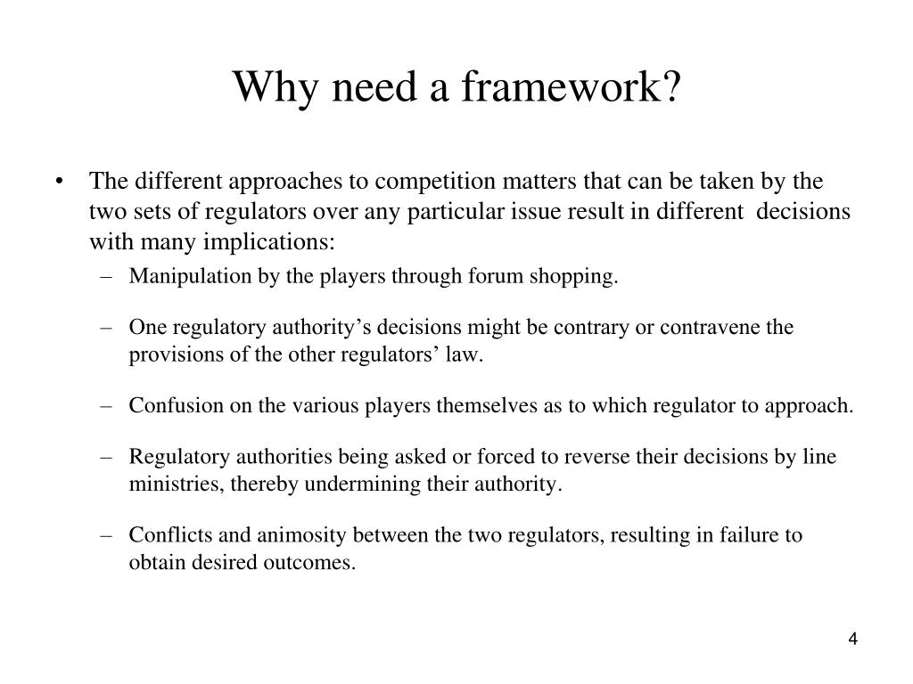 Why need a framework? • The different approaches to competition matters that can be taken by the two sets of regulators over any particular issue result in different decisions with many implications: • Manipulation by the players through forum shopping. • One regulatory authority’s decisions might be contrary or contravene the provisions of the other regulators’ law. • Confusion on the various players themselves as to which regulator to approach. • Regulatory authorities being asked or forced to reverse their decisions by line ministries, thereby undermining their authority. • Conflicts and animosity between the two regulators, resulting in failure to obtain desired outcomes.