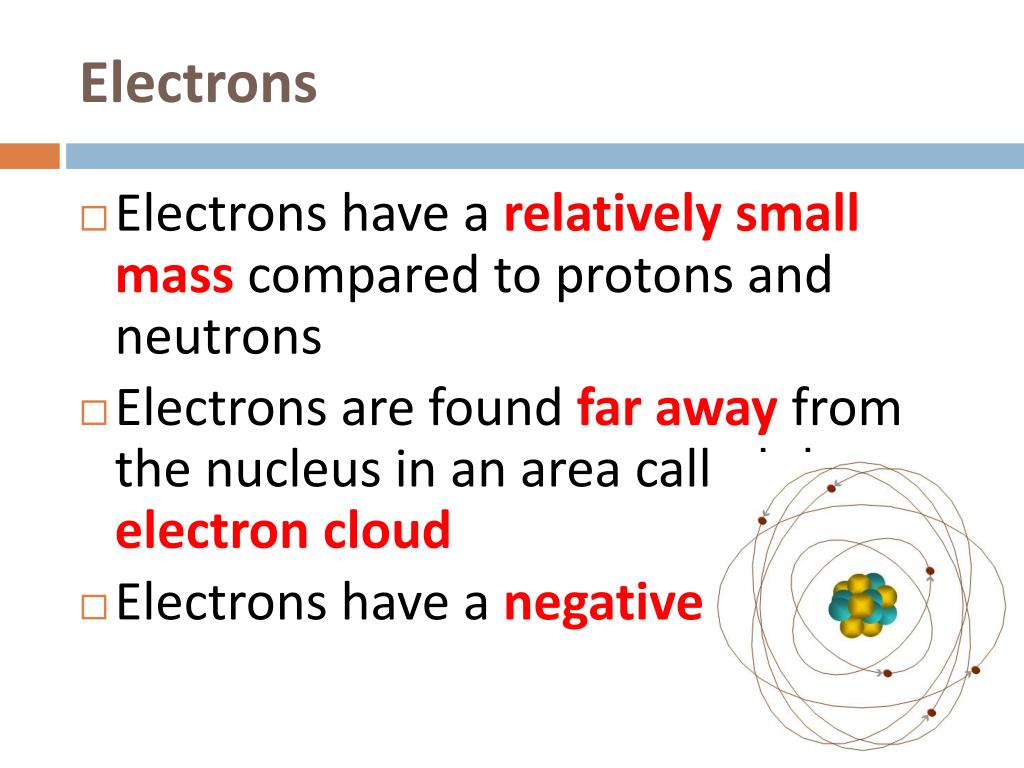 Electrons • Electrons have a relatively small masscompared to protons and neutrons • Electrons are found far away from the nucleus in an area called the electron cloud • Electrons have a negative charge