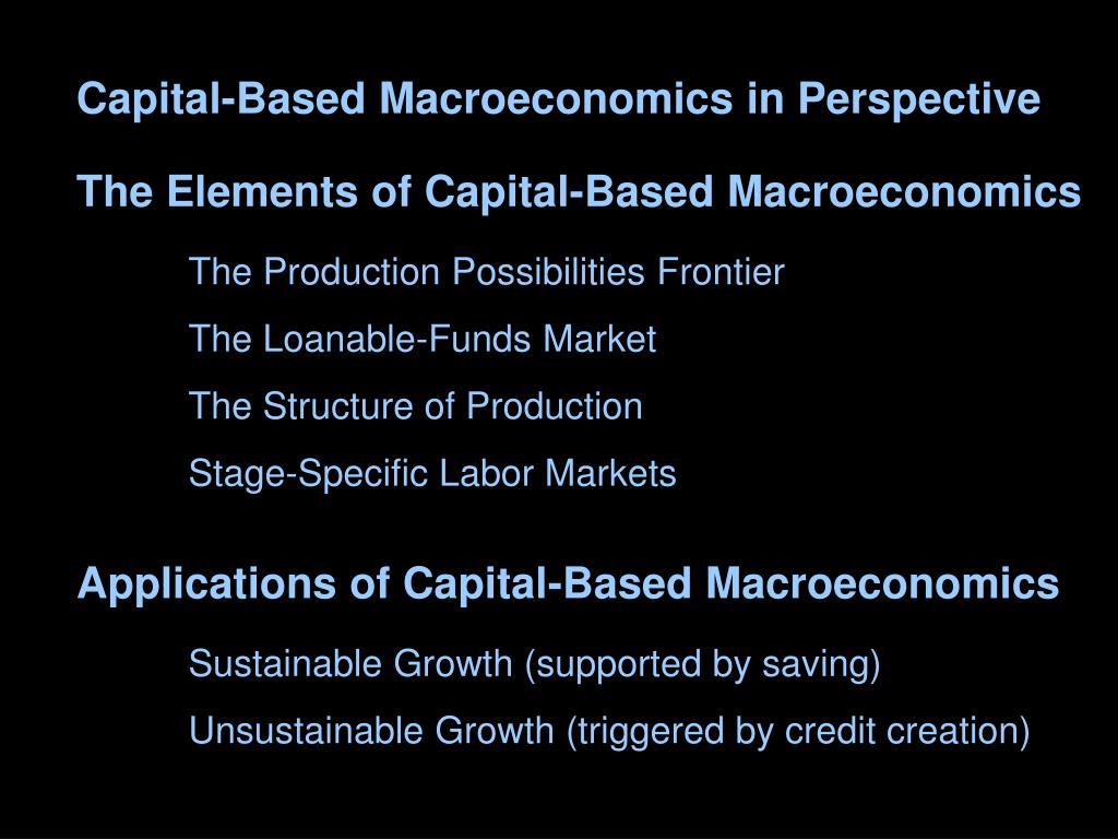 Capital-Based Macroeconomics in Perspective The Elements of Capital-Based Macroeconomics The Production Possibilities Frontier The Loanable-Funds Market The Structure of Production Stage-Specific Labor Markets Applications of Capital-Based Macroeconomics Sustainable Growth (supported by saving) Unsustainable Growth (triggered by credit creation)