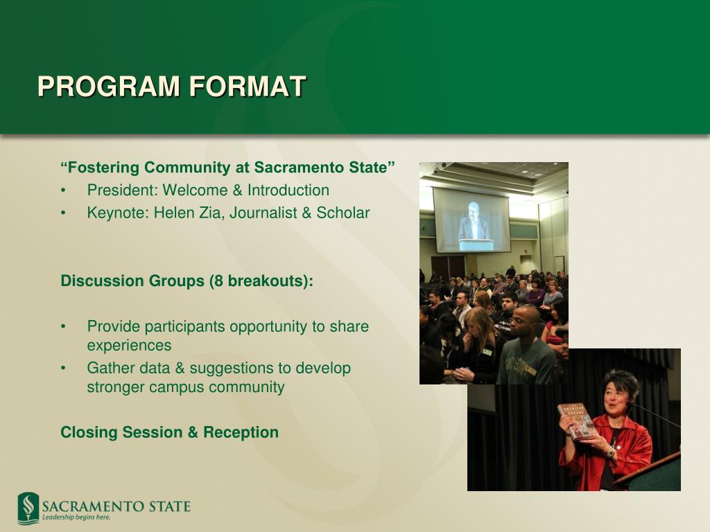 PROGRAM FORMAT “Fostering Community at Sacramento State” • President: Welcome & Introduction • Keynote: Helen Zia, Journalist & Scholar Discussion Groups (8 breakouts): • Provide participants opportunity to share experiences • Gather data & suggestions to develop stronger campus community Closing Session & Reception
