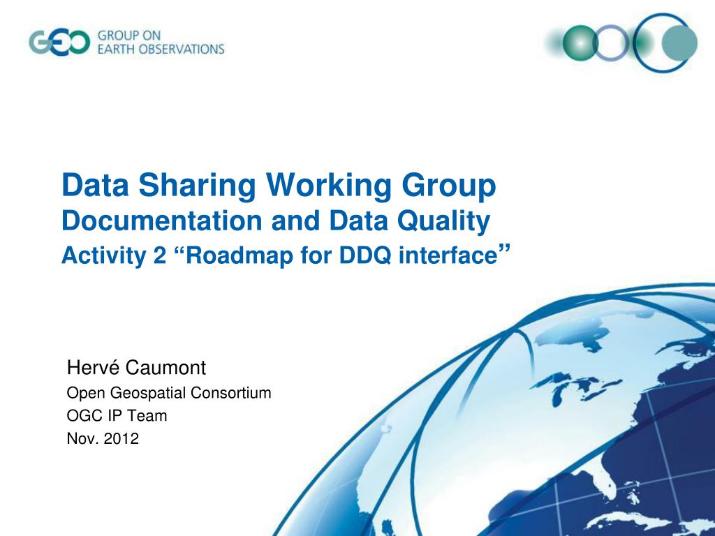 Data Sharing Working GroupDocumentation and Data QualityActivity 2 “Roadmap for DDQ interface” Hervé Caumont Open Geospatial Consortium OGC IP Team Nov. 2012