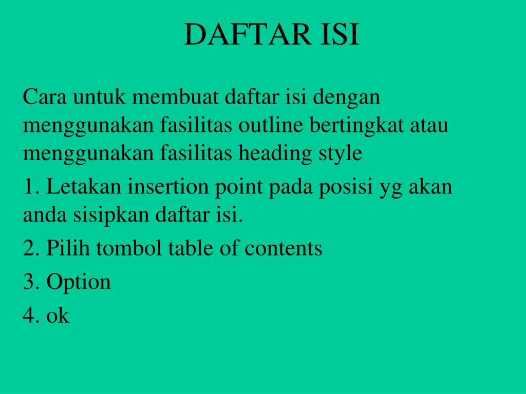DAFTAR ISI Cara untuk membuat daftar isi dengan menggunakan fasilitas outline bertingkat atau menggunakan fasilitas heading style 1. Letakan insertion point pada posisi yg akan anda sisipkan daftar isi. 2. Pilih tombol table of contents 3. Option 4. ok