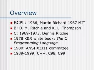 Overview • BCPL: 1966, Martin Richard 1967 MIT • B: D. M. Ritchie and K. L. Thompson • C: 1969-1973, Dennis Ritchie • 1978 K&R white book: The C Programming Language • 1980: ANSI X3J11 committee • 1989-1999: C++, C98, C99